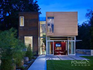 房屋有四個截然不同的部分組成:玻璃圍繞的主樓生活區(qū),木頭包裹的上部臥室層,鋼鐵鎧裝的延伸到背面的“服務”區(qū)域,以及一間懸臂的灰泥覆蓋的辦公室。房屋的基礎概念是一條可延伸房屋長度的直線的,充滿光線的走廊。這片空間在所有的樓層中把“被服務”從“服務”的功能中分離出來,包括平面的和縱切面的。