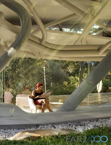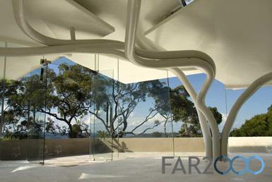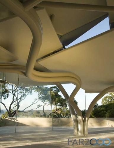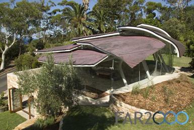 頂棚狀的屋頂用一層層銅板制作,并在各層之間形成罅隙和羽毛狀的邊緣,像一座涼棚控制著光線的射入。石質(zhì)平臺嵌入到地面,將內(nèi)部空間與花園的各個部分里連接起來。而墩座部分是從崖壁上挖鑿出來的,作為一個熱量的沉降池,抵消了上部建筑暴露在外所吸收的熱量。