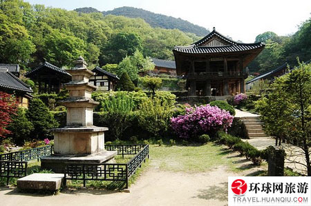 在慶州市還有一個地方不得不提,那就是以新羅時代為主題的新羅千年公園,也正是韓國電視劇《善德女王》的拍攝地。沿著土路小徑一路延伸進入,各種佛像雕刻不規則地倒置在兩旁,低矮的山坡樹木茂密,藏于其中的陶俑表情各異,嬉笑怒罵構成了人生酸甜苦辣的百味陳雜之態,而可愛的樹樁木偶或呲著門牙,或瞇眼嬉笑,甚至吐出舌頭發出咯咯笑聲,不知者也會一驚,隨后莞爾一笑,被這些小插曲吸引。公園的深處便是炫麗的宮殿和模擬新羅時代古建筑的民居茅舍,宮殿紅柱青瓦,石獅龍仗,盡顯華麗。而公園內每天兩次的花郎武藝公演和重現電視劇中情節的表演讓游客了解新羅時代的文化,生動形象,為韓國之旅增添了歷史文化韻味。
