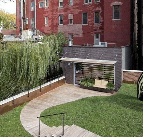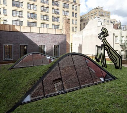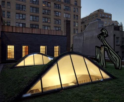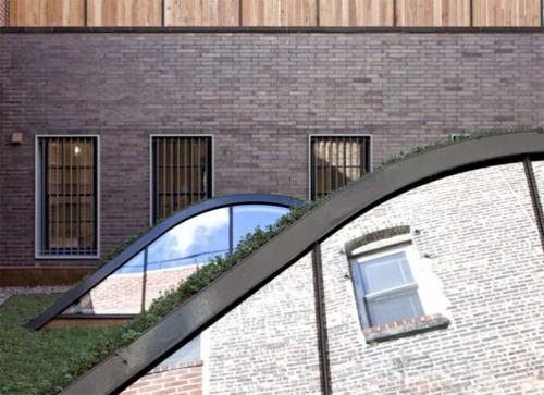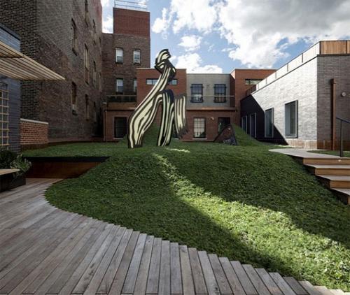 近日,Caliper設計工作室成功的將紐約市中心的一群笨拙的老磚房設計成了極巨觀賞價值的“樓群綠化帶”。此項設計中最具亮點的當屬屋頂花園中的閣樓了,閣樓的屋頂與公寓的屋頂完美的融合到了一起。這項設計的影響不僅僅在于其自然的融合了兩個獨立部分的屋頂,更在于它為寸金寸土的都市提供了寶貴的綠地以及緩解了熱島效應,在炎熱的夏日,為這片區域帶來了涼爽。