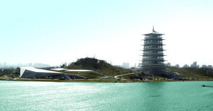 在一片碧波蕩漾中,2011西安世園會標志性建筑——長安塔巍然屹立。