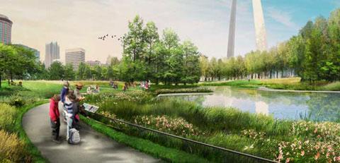 中國風景園林網訊:范.瓦肯伯格景觀設計事務所團隊力壓群雄,戰勝了其他四個團隊獲得了競標勝利。評審團選擇范.瓦肯伯格景觀設計事務所的方案,因為他們更能給這個地方帶來生機,大拱門(Gateway Arch)周邊連接了圣路易斯市區、密西西比河和伊利諾斯銀行。
