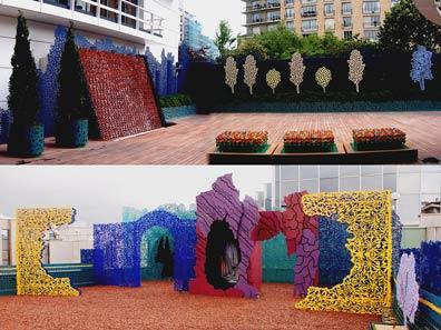 主要的臺地花園是位于總部大樓較低層的“四季園”和在另一座大廈七樓的“碧色劇壇”。在四季園中,拉索斯利用激光技術把金屬穿孔板雕刻成活潑的樹木和灌木形狀。這個花園位于噴泉的前方,配設有彩色小樹,人們可在此舉行大型雞尾酒會。花園的業主獲贈4組金屬樹木,每組涂有不同的顏色代表不同的季節,因此他可以按照自己的愿望來改變花園中的季節,使在花園里的客人驚奇地感受到與城市里其他地方不同的季節。