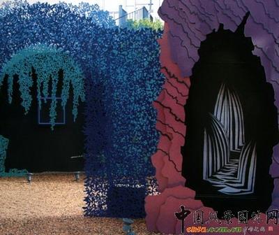 碧色劇壇是一座與眾不同、頗有魅力的花園。這個花園展現了一個花園劇場,而且為了增加反諷意味,舞臺上唯一的角色是一個花園洞室,里面放置著一個隨時間變化而改變顏色的燈光噴泉。這些屋頂花園既具有錯綜復雜的顏色和樣式,也有對自然和人工、集體和個體之間的聯系的詼諧評論。