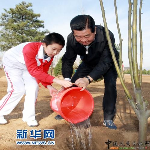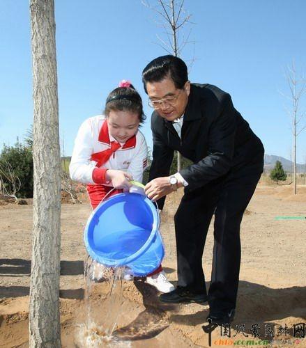 胡錦濤同少先隊員一起給剛栽下的樹苗澆水
