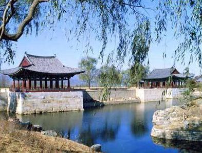 此園建于文武王14年(即674年),后毀于戰亂,1975年復原。據考,園內水池中曾堆三島,分別象征蓬萊、方丈、瀛洲三神山,象征巫山的十二峰分別位于池北和池東,沿池共有十二座建筑。雁鴨池曾是新羅王子的東宮,每逢喜慶節日,王子都要在園內大宴賓客,歌舞升平。現在雁鴨池園內只重修了水池,三座島嶼和池西的三座建筑。雁鴨池理水頗為成功,水池略為方形,占地約十余畝。由于得當地布置了三個島和兩個伸入水面的半島,使水面或開闊舒朗或瀠洄幽深,收放自如,頗具天成之趣。特別是池東北、東南巧妙地運用了“藏源”的手法,起到了延伸空間、變換景致、小中見大的作用。