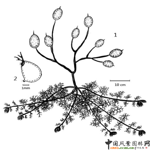根據(jù)Parautricunaria watanukii sp。 nov。 Fuku。的模式標(biāo)本繪制的示意圖(Fukuzumi et al., unpublished data。[2] Figure 1):1,全株,我們可以看到水上部分的“片狀體”以及水下部分的復(fù)雜分枝,在分枝的末端生長著許多“囊狀體”;2:“囊狀體”的特寫。