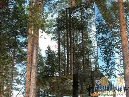 樹頂旅館TreeHotel,鏡立方旅店的6個房間(最后一個正在修建中)面積從15到30平米不等,全部懸在4-6米高的樹上。它們主要用木頭蓋成,。它們有的像一個巨型的鳥窩,有的則像懸在樹枝間的小棚子。而圖中的這間名叫“鏡立方Mirrocube”由THAM&VIDEG?RDARCHITECTS工作室設計,鏡子的運用讓它幾乎消失在了樹影之間。而設計師還細心的在鏡子外面增加了紅外涂層,避免小鳥誤撞到上面而受傷。