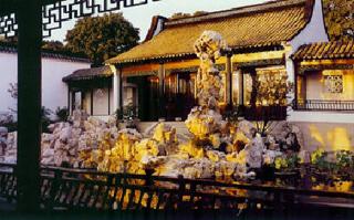 此春水飛濺小景,令游客欣然“入趣”。園中主體建筑——水上石舫,裝飾非常精美。船尾飾有鍍金雙龍戲珠木雕,栩栩如生。石舫前后門框分別鑲以流金溢彩的梅花喜鵲木雕和古色古香的松鶴木雕。舫內8塊印花玻璃,映現著古代中國園林的秀姿和青銅器皿的圖影。兩盞宮燈高懸于舫首頂端。
