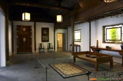 書齋庭園區建筑精致,造型美觀,古樸淡雅。書齋門上懸有“四宜書屋”匾額。屋內一側為坡鄒角亭,另一側湖石散置,松竹梅蘭等花木點綴,景色別致,幽雅宜人。