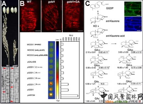 A.突變體種子和穗以及細(xì)胞生長受阻。B.GA恢復(fù)突變體微管排布,GDD1具有轉(zhuǎn)錄激活活性。C.GDD1的定位與突變體GA代謝。