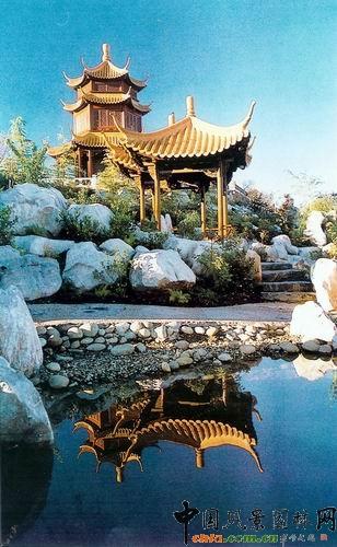 在誼園的大門兩側,威武地站立著一對石獅子。曲折的回廊,像兩只大臂膀左右張開,環抱湖水。亭間的嵌空龍壁上,游龍好像在戲水爭珠;竹石山房,四周環境幽靜別致。誼園后部,有曲折的石徑蜿蜒而上,可到達山頂,山頂上是園中的最高建筑物“澄觀閣”。澄觀閣有3 層檐,呈六角形,金黃色的琉璃瓦頂,朱褐色的墻。在此處俯視湖水,波光瀲滟;遠眺港灣,海風徐徐吹來,令人心曠神怡,心神俱爽。在澄觀閣上還可眺望悉尼市景,悉尼高塔和摩天大樓矗立在藍天白云之間,它們和眼前的古典亭閣繪在一個畫面里,既協調又新異,展示出東西方文化的交融。