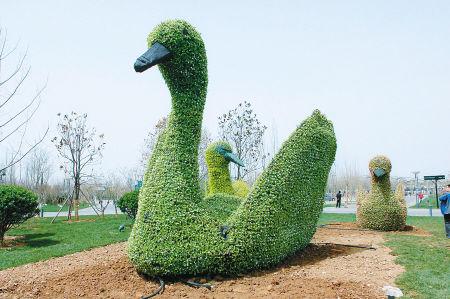 在本屆世園會上,有30多處主題各異的綠色植物造型,它們有大到夸張的蝸牛,憨厚戲耍的大笨熊,在風中舞動的6位練習太極的“掛面人兒”,還有鐘情于長安塔、比劃出一幅取景框的大手等,目前已有部分綠雕完成了施工。