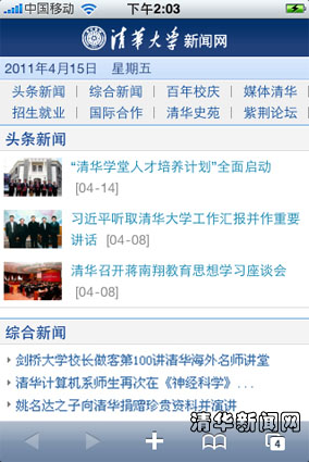 清華大學移動門戶首頁截圖