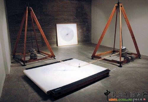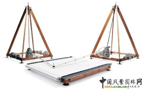 設(shè)計師對19世紀文藝復興時期的鐘擺和諧振記錄器報有很大興趣,這個機械裝置由兩個2.7m高的三角形框架組成,每個三腳架中心都懸掛了一個沉重的鐘擺。通過添加或減少砝碼,這些鐘擺的重量可以最高調(diào)整到75kg,不用的時候,這些砝碼還可以存放在三腳架底部。砝碼重量越輕,畫出來的圓圈更小,然而更輕的重量會導致砝碼鐘擺搖晃的更厲害,所以畫出的圓圈也更大。