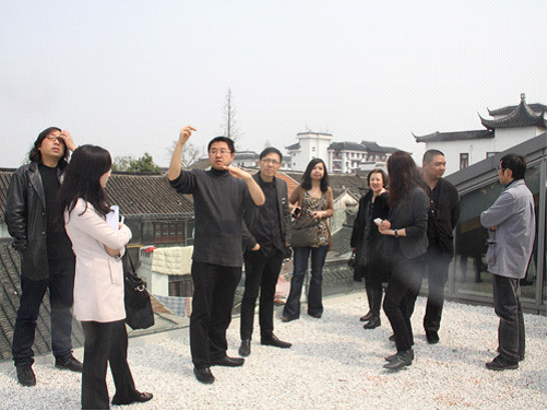 在建筑師祝曉峰的帶領下,張斌、李翔寧、劉宇揚、莊慎、王方戟、彭禮孝、彭怒等建筑師嘉賓一同參觀了新建成的"朱家角古鎮人文藝術館"。主創設計師祝曉峰就其作品為大家進行了詳細的講解。