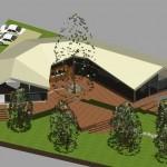 “貝殼館”(ShellHouse)的外形輪廓呈現(xiàn)了J的形狀,內(nèi)側(cè)外墻升起地面1.4米,產(chǎn)生好像漂浮半空的平臺。利用Ulin木材圍繞著建筑創(chuàng)建了階梯狀臺階,圍繞出一個家庭活動的中心庭院。
