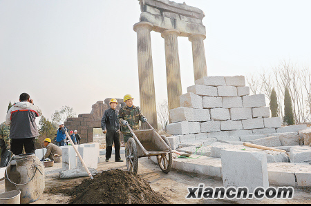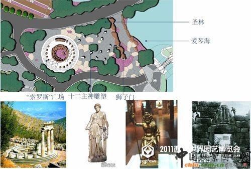 索羅斯廣場以希臘德爾斐遺址廣場為原型,豎立著數根高大石柱,展示著對西方建筑影響深遠的希臘柱式以及完美比例的運用。而圣林里將擺放希臘神話傳說中的12尊主神雕塑,為游客詳細展示希臘的神話人物,使古希臘文化氛圍突現。古希臘園最引人矚目的是獅子門。兩根穩健的石柱承載著笨重而略成弓形的石制橫梁,橫梁上面是巨石砌成的拱門,巨石的正面是一組浮雕:兩只對稱的獅子一左一右以前足踏立在祭壇上,中間立著一根象征著宮殿的柱子。設計人員介紹說“獅子門是邁錫尼衛城的入口。門上的疊澀券對以后的建筑有著深遠的影響。”獅子的造型宏偉生動,配上這巨型拱門,使人有了置身宮廷的感覺。希臘被譽為藍寶石之國,這不僅因為他的神秘和故事性很符合這種寶石的色澤,更是因為他無與倫比的美麗。也許,一次希臘園的觀賞,一個美麗的藍寶石之國夢想也會不太遙遠。