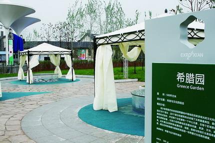 希臘園利用現代科技表現希臘地中海地區的觀光、建筑等文化特色。展園分五個部分,各有其中心元素、畫報橫幅與屏幕錄像,分別介紹希臘地區的整體印象、旅游、文化、建筑和特色美食。此外還通過運用特殊金屬材質、視頻、音頻與特效燈光展示現代希臘的一面,通過視頻音頻系統創造出了一場希臘文化信息的盛宴。設計師還用獨到的設計,為我們還原了一個古希臘園林。置身此園,你不禁會有夢回古希臘的感覺。