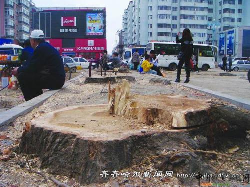 “看,最粗壯的直徑近90厘米,樹齡最少也有七八十歲!”市綠化辦有關(guān)人員現(xiàn)場(chǎng)告訴記者:這些原生態(tài)樹,比人工種植的更加金貴!據(jù)了解,富拉爾基區(qū)在“一五”期間,大規(guī)模建設(shè)發(fā)展,這些樹見證富區(qū)的成長(zhǎng),幾十年風(fēng)霜雪雨沒有被擊垮,如今命喪“三優(yōu)”文明城建設(shè)當(dāng)中!