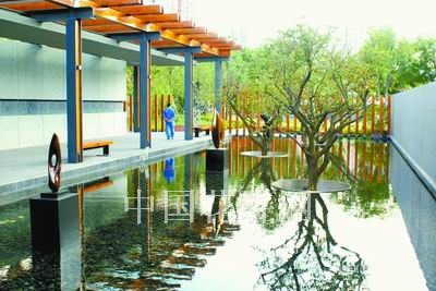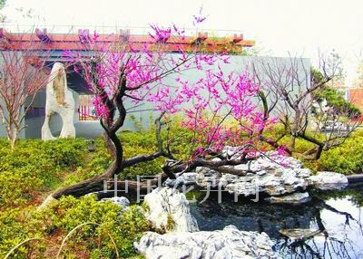 栽種在水池內(nèi)的梅花與現(xiàn)代雕塑巧妙搭配