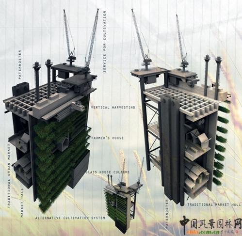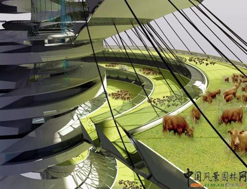 在概念設計上,多層的垂直農場競爭激烈。讓這個設計脫穎而出的是它可以直接在農場大樓上面飼養家畜,在摩天大樓上面養家畜確實是一個很酷的新概念。層疊交錯的草地可以充分的吸收陽光。