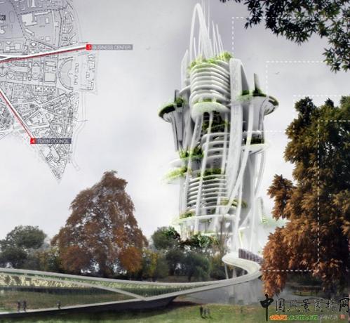 這個建筑的設計靈感來自大樹,不僅外型類似樹,結構體系也是模仿大樹的,它由一個中心集線器、火車道組成的路徑、主體有風力渦輪機和太陽能電池板還有根部的水資源收集系統組成。
