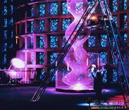這是一尊高7.5米的動態聲光雕塑,人站在這個金字塔形的鐵架之下,一舉一動都會被被檢測到,與此同時,雕塑也做出相應的互動。