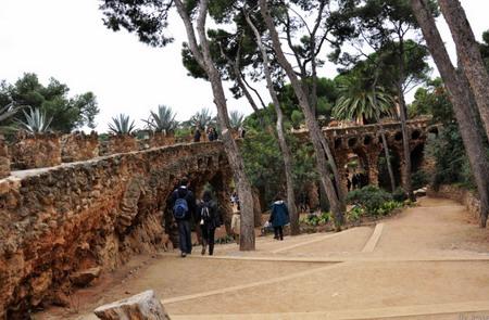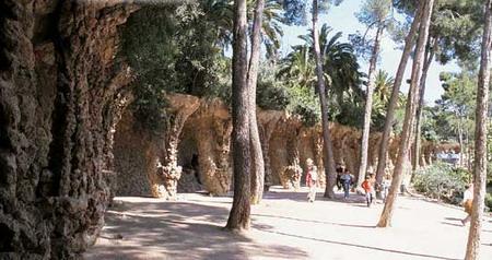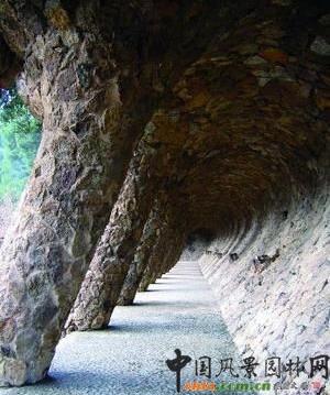 古爾公園將高迪的建筑天賦展示得淋漓盡致。這里地形復(fù)雜,增加了填土和修筑土堤的難度。為避免耗資巨大的石質(zhì)挖方工程,高迪設(shè)計(jì)建造了三座高度不同的高架走廊。高架走廊依山勢建造,其使用的材料均是當(dāng)?shù)厥┕ね诔龅耐潦纱伺c周圍的自然環(huán)境極為統(tǒng)一和諧。高架走廊可以說是古爾公園的人行道,上方可以走人,下方廊子亦可。而百柱廳兩側(cè)的這段走廊,是廣告片和電影導(dǎo)演鐘愛的場景;另一條最低地勢的走廊,為兩排向內(nèi)傾斜的石柱支撐。在技法上,高迪將柱身的直徑大大增加,柱溝的數(shù)目卻有意減少,曲線的文飾更加厚重,扁平的頸部堅(jiān)定厚實(shí),以區(qū)別于希臘苗條纖細(xì)的柔軟。此外中楣和上楣三角槽的排檔上懸垂的錐形裝飾也體現(xiàn)了自然主義的風(fēng)格,它讓人追憶起建筑誕生的古代。事實(shí)上,高迪發(fā)明了一種新的柱形,就地取材,提升社區(qū)品質(zhì),并將建筑融入周圍環(huán)境,石柱的莊嚴(yán)與那明亮鮮活的瞭望臺(tái)形成了強(qiáng)烈對比,這就使坡地建筑達(dá)到最大的功效。這些沒有底座的石柱,看上去好像從地里生長出的樹干。在高架走廊的設(shè)計(jì)中,自然形式與建筑形式之間開始了真正的對話。