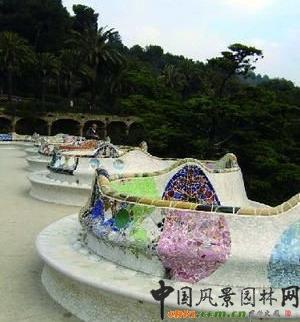 百柱廳上的廣場有個“世界最長的椅子”之稱的彎曲長椅。西班牙人稱它龍形椅。這個造型如龍的彎曲長椅,全部使用不規則的馬賽克瓷磚拼貼,而這些色彩絢爛迷人的拼貼圖案,有高迪親自設計的,也有工人自由發揮創作的。在其所有作品中,高迪總迷戀于各種色彩:“不論過去還是將來,裝飾物都應被染上顏色。大自然呈現我們眼前的萬事萬物,無不具有自己的色彩:植物界、地質學、地理學和動物界中的一切,構成了鮮明的顏色對比。這就是為什么每個建筑元素都必須著色的原因。”