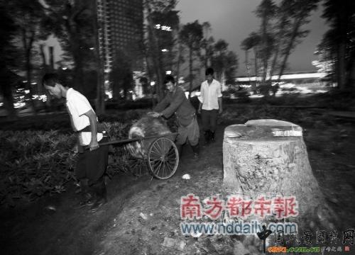 前晚10點左右,有讀者報料稱花城廣場農業(yè)銀行段,有園林工人“趁深夜”在鋸掉枯死的大樹。南都記者隨后趕到現場發(fā)現,確實有10余名園林工人在農業(yè)銀行旁對幾棵枯死的多頭樟實施“鋸木”手術。