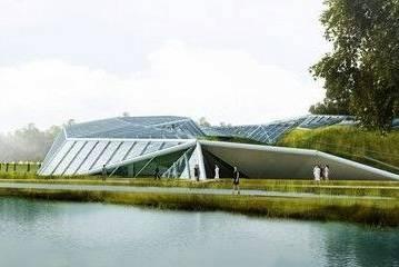 位于錦繡湖畔的自然館就是一座巨大的植物溫室,主要展示世界上不同地域、不同氣候帶的珍稀植物及生態景觀。自然館建筑本身半埋地下,立面材料選用玻璃、木材與少量混凝土結合,保證整個館內有充足的光照。自然館倚山而建,層層疊疊,與地形完美結合,從高度上、視覺上弱化了建筑的體量,保證在建筑內部也可以從不同角度領略錦繡湖面和更遠處各個展園的美景。
