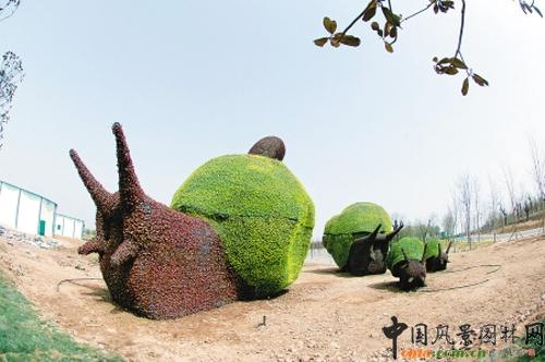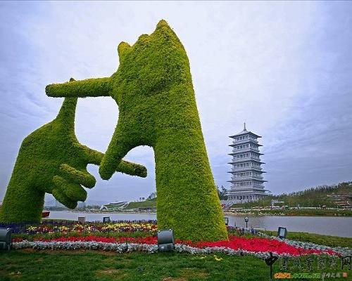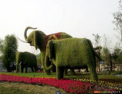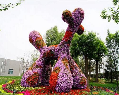 “綠雕”被譽為世界園林藝術的奇葩,是一種有生命的植物雕塑。一般內設鋼材構架,然后在構架上填充栽培土,再于其上種植一年生或多年生小灌木或草本植物,即采用掛泥插草或卡盆工藝把不同顏色的花草覆蓋在結構造型的表面,巧妙地把雕塑造型與花卉園藝結合在一起,鋼架表面的植物覆蓋率至少要達到80%。因此,綠雕是充滿生機的“花卉雕塑”,是人類運用自然力量創造出的又一園藝文明。