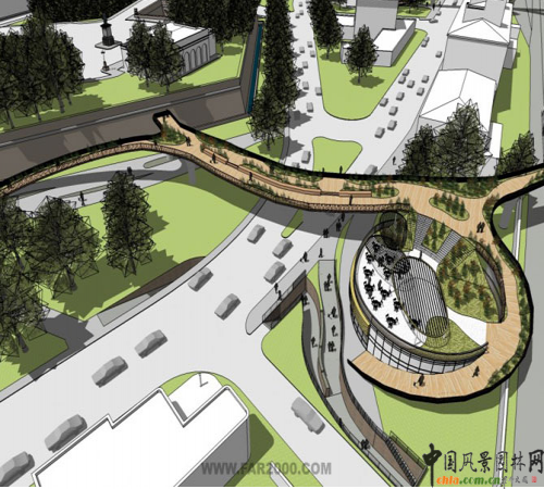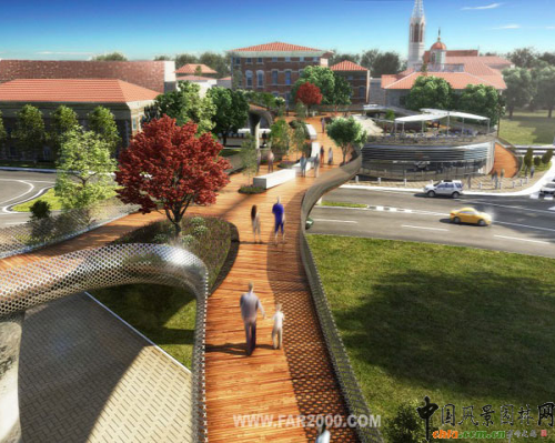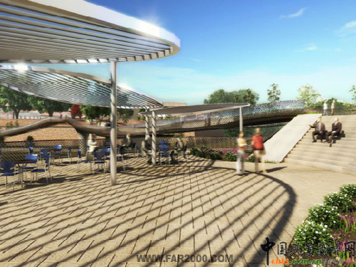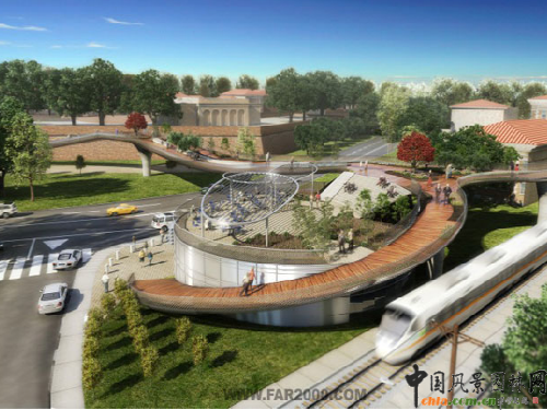 盧卡市擬在環(huán)繞老城區(qū)的環(huán)城路上建造兩座人行過街橋,環(huán)城路既是城市的交通干道又是城區(qū)主要的綠化帶。BHDP建筑設(shè)計公司在設(shè)計中把過街橋的功能和區(qū)域景觀、綠化、公共休閑空間等進行綜合考慮。傳統(tǒng)設(shè)計中的人行過街橋功能單一、造型生硬、也很難與周圍環(huán)境景觀相融合。這個設(shè)計方案在造型上使用圓和弧作為母題,橋體具有流暢優(yōu)美的圓弧形流線,人行步道以木板鋪砌顯得親切柔和,同時在橋面上設(shè)置花壇種植樹木,還設(shè)有路椅行人可以在此頓足休息;由引橋步道圍合而成的圓形平臺設(shè)計成公共休閑空間,上置圓形格柵式遮陽頂棚,同時擺放了多組桌椅,作為市民休閑觀景平臺。