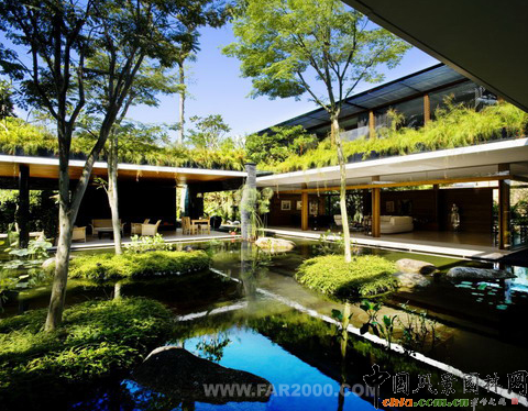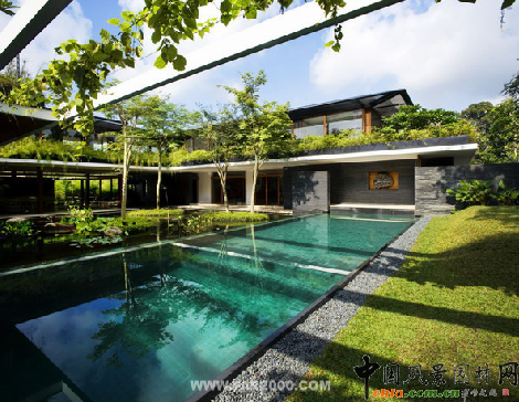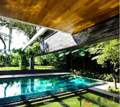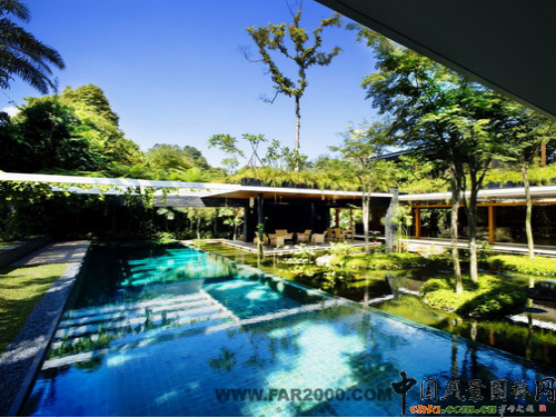 Cluny住宅共兩層面積1505平方米,形式為庭院圍合式,其突出特點是它的園林設(shè)計。在庭院種有熱帶喬木、搭有藤架、在一層屋頂外沿種有花草,使整個庭院處在綠茵之中;泳池建在院子中間,起居室做成半開敞形式,以此抵御南亞濕熱的氣候。