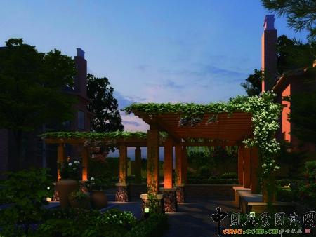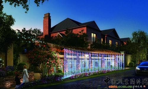 北入口廊架:廊架構(gòu)造,木質(zhì)壓頂給人以厚重、親切的感覺;石砌基礎(chǔ)增加整體體量感;在夜間燈光照射下,水簾的輕盈、吉祥花境的若隱若現(xiàn)烘托浪漫溫暖的氣氛。