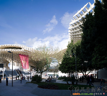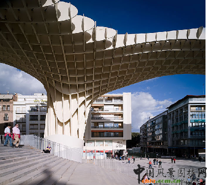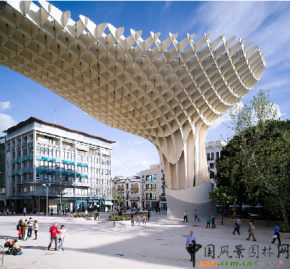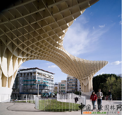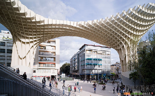2011年4月初建成的“都市陽傘”是塞維利亞市恩卡納西翁廣場城市改擴建工程,整個工程包括博物館、劇院、農(nóng)貿(mào)市場、酒吧餐館和廣場,旨在打造一個綜合性的公共中心。工程主體部分是一組巨大的蜂窩狀木質(zhì)結(jié)構(gòu)形成一個巨大的“陽傘”,陽傘底部是博物館,木結(jié)構(gòu)上部有觀景露臺。它把新創(chuàng)造的獨特空間和老城區(qū)結(jié)合起來,同時融入文化與商業(yè)要素,這個新的多功能的文化、商業(yè)、旅游設(shè)施已成為塞維利亞市新的地標。