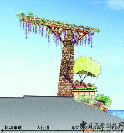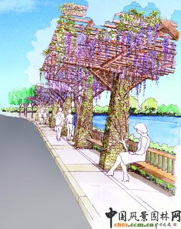 入口景觀:考慮到空間的不足又緊鄰岸邊,本案中沿路邊設置了單邊廊柱以減少廊架基礎占地面積,并且結合原木欄桿座椅,保證了臨水安全。為了擴大遮陰面積,我們將木格柵頂雙邊平衡出挑,并用三角型小梁穩(wěn)定加固;并給攀援綠植留足花果的懸垂空間。為了滿足通風需要,我們對普通的藤架進行加高架寬處理,結合地勢,在高的地方設置種植槽,有效的解決了攀爬植物分支點低的弱點,為更快的呈現(xiàn)預期蔭涼效果做充分準備。