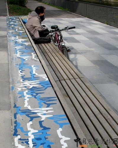 該設計中休息長凳和藍色涂鴉