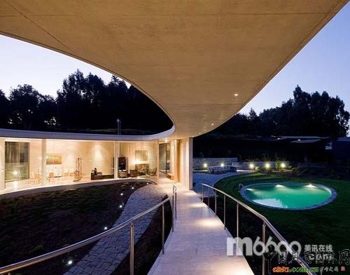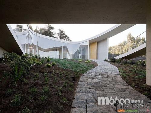 住宅與所在地點形成了一個單一的連續空間,住宅依地形建造了一條盤旋于房子的小路,房子中間有一個部分封閉的花園。斜坡上的一條自然形成的小路可將游客帶到房屋的后方,同時,在花園內,這條傾斜的小道同盤旋于房子上的小路相連,游客可以從這里進入到住址內更為私密的空間。