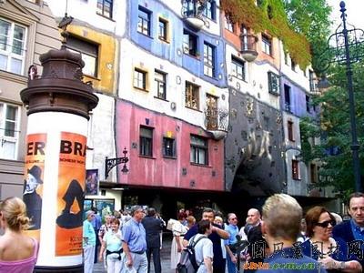 乍眼看來,這座古怪的房子就像是西班牙建筑師高迪的作品,亦有人說百水先生的確是受過高迪的影響而有此作品。但西班牙我沒去過,光看到這座房子已經(jīng)讓人驚嘆。這座建造于1983年-1985年的建筑杰作,由百水先生利用弧線、顏色、幾何形狀、磁磚及廢物建造而成,屋的陽臺(tái)、外墻壁及天臺(tái)種滿了各式植物,如果在秋天時(shí)分到訪此地,這兒就像是一個(gè)色彩互相交錯(cuò)的現(xiàn)代童話宮殿。