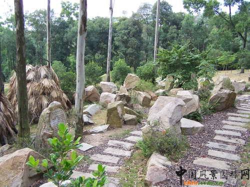 巖石園是一種西方園林,用于種植、展示生長在崖壁、巖縫、巖層間隙的野生植物,有別于中國的假山。巖石園中一塊小的區域常能生長許多種植物,在有限的空間能集中豐富的植物種類,如匍匐植物、地被植物、各種草花、小灌木、藤本植物等。澳洲植物專類園的巖石園地勢呈高低起伏,道路用石塊鋪設,建造時按各種巖生植物的生態環境要求,選取具有代表性的山石,模擬澳洲島嶼山地的裸露巖層景觀,所用巖石未經人工雕鑿,有立有臥,有丘壑,疏密相間,石與石之間留有縫隙與間隔,用以填入各種巖生植物生長所需的土壤。在大巖石旁種有產自澳洲的方葉五月茶(Antidesmaghaesembilla)、澳洲蒲桃(Syzygiumaustrale)等矮生喬木、巖石間種植有高崗松(Baeckeavirgata)、巖生紅千層(Callistemonpearsonii)、澳洲米花(Ozothamnusdiosmifolius)、石南桃金娘(Babingtoniatozerensis)、年青蒲桃(Xanthostemonyoungii)等小灌木,石縫隙中長有攀援、纏繞的草質藤本植物,地面上的草坪形成自然植被,頗具山區野趣,充滿曠野的冷峻、荒涼氣息,體現出一種自然、原始、真實之美。