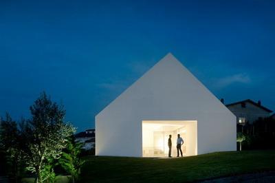 房子地面部分看上去無窗,自上而下全部被涂成白色。毗鄰建筑的四角,在草地上各切入一個地下小庭院,為處于地下的臥室區域帶來采光,同時沿墻延伸出一片地面,如同房屋看不見的根系。