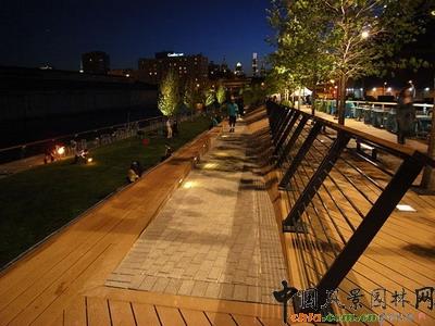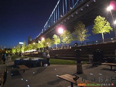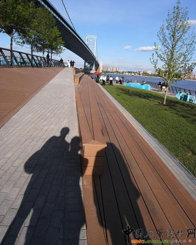 “原來的Race街碼頭始建于1896年,包括大量的兩層建筑,以滿足各種需求;下層用來停泊船只,上層用來娛樂。新的碼頭也設計了兩層——上層完美的露天散步場,下層是社交娛樂場所。本杰明.富蘭克林大橋北面有12英尺傾斜上升的斜坡,透視效果使你感覺就要到達河邊。多功能草坪上設有階梯,既能坐又能躺。長長的階梯座椅將兩層連接起來,環繞了碼頭一端,放大了身處邊緣的魔幻感覺。
