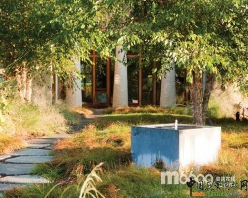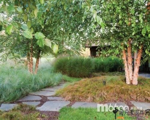 在住宅入口處,花園和莎草構為橘色染紅粗糙的樺木創造了一個綠色的背景。