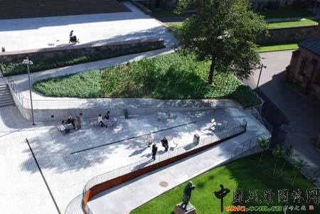 該設計中最引人入勝的是設計了一個高差約有7米的人行步道邊坡,連接上下兩層的街道,人們不經(jīng)過一級級的臺階就可以穿越整個廣場。人行步道斜坡的坡度最大為6.5%,在每一段斜坡設置休息平臺供人們休息、觀景。這個特殊人行步道已經(jīng)成為廣場一道亮麗的風景線。順著邊坡,移步換景,可以更好地感受豐富的綠色空間,原來在停車場位置的漢斯艾格德雕塑被安置在綠植顯著位置。
