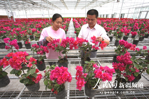 6月17日,新疆塔里木墾區二十九團現代化智能聯棟溫室內兩名花農正在培育花卉。