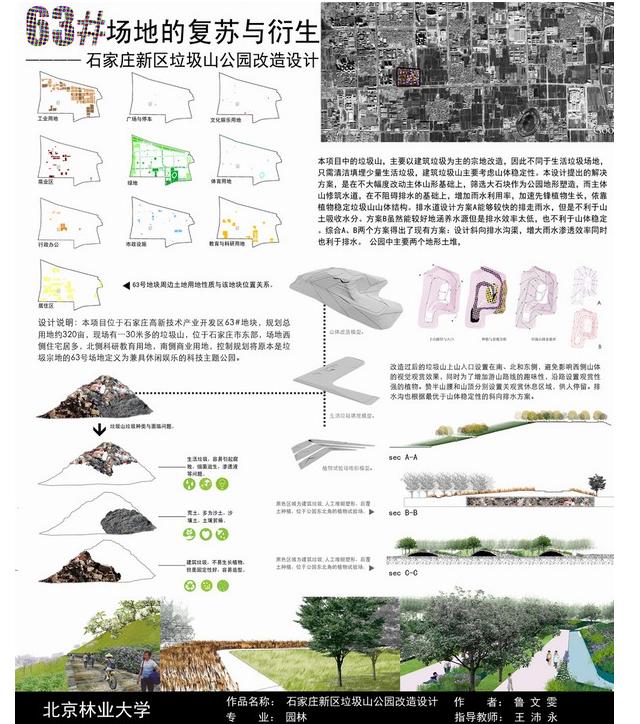 設計說明:本項目位于石家莊高新技術產業開發區63#地塊,規劃總用地約320畝,現場有一30米多的垃圾山,位于石家莊市東部,場地西側住宅居多,北側科研教育用地,南側商業用地,控制規劃將原本是垃圾宗地的63號場地定義為兼具休閑娛樂的科技主題公園。本設計提出的解決方案,是在不大幅度改動主體山形基礎上,篩選大石塊作為公園地形塑造,而主體山修筑水道,在不阻礙排水的基礎上,增加雨水利用率,加速先鋒植物生長,依靠植物穩定垃圾山山體結構。