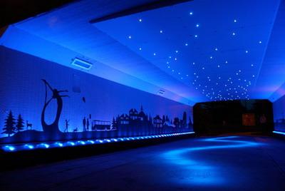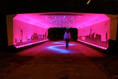 中國風景園林網訊 英國北部拉納克郡理事會委托Bigg和Zero—Waste設計團隊設計坎伯諾爾德地下通道,新工程為地下通道增添了炫目的燈光和壁畫設計。