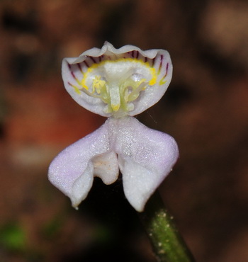 回到園內放電腦上看的時候發現這個小草本竟然是蘭科(Orchidaceae)植物雙袋蘭(Disperis neilgherrensis Wight),于是7月6日兩人重返原地尋找當時丟棄的小花。經過反復尋找,終于在原地找到當時丟棄的植株殘余,并幸運的發現了另外3株完整的植株。